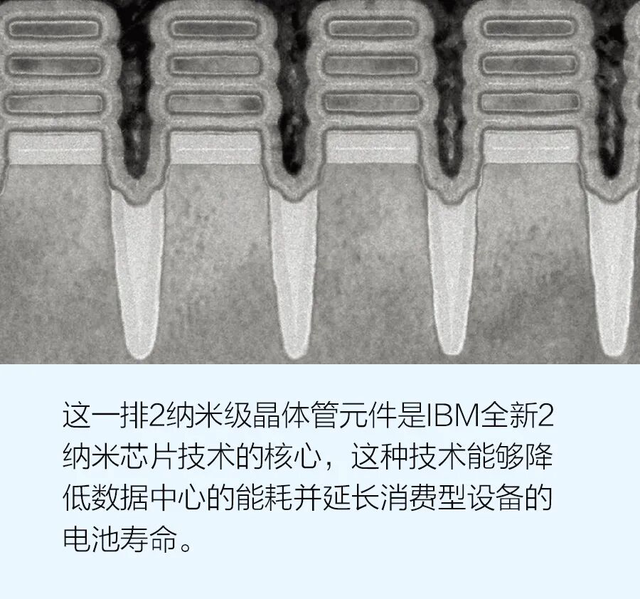 不久前,IBM成为全球首家推出2纳米节点芯片的公司。该公司表示,与目前的7纳米芯片相比,这款新的芯片能够在耗电量相同的情况下将计算性能提高45%,亦即在维持相同计算性能的情况下使耗电量减少75%。可以这样理解,采用2纳米技术,IBM可以在一块指甲大小的芯片上放置500亿个晶体管。