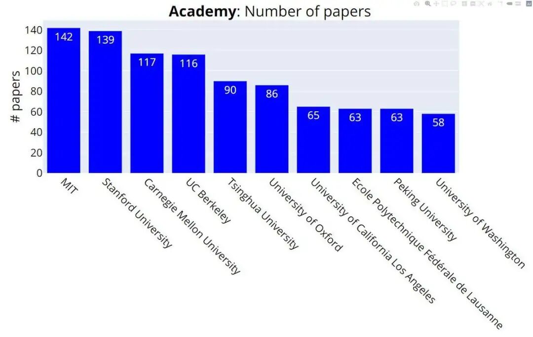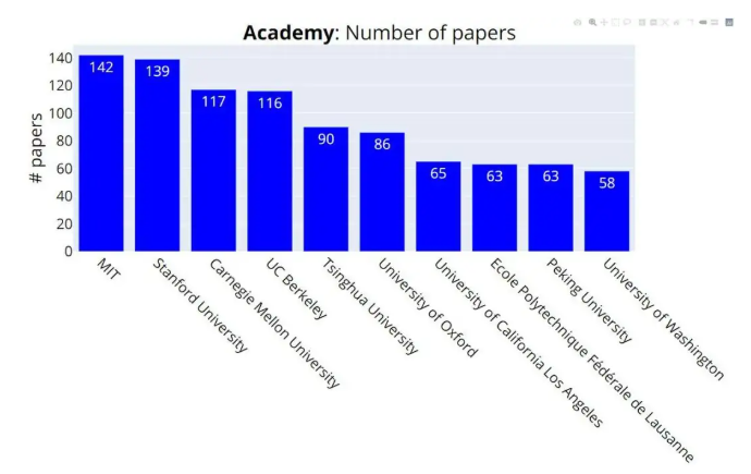 MIT总共提交了142篇论文,成为投稿最多的高校,以3篇论文的优势超过投稿139篇的斯坦福。