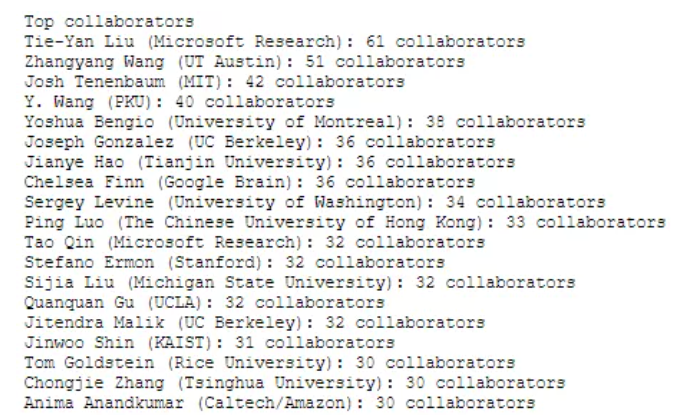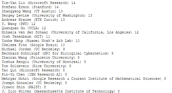 华为诺亚方舟实验室的王云鹤、普林斯顿大学的Zhaoran Wang、微软亚洲研究院的秦涛和IBM的Pin-Yu Chen分别有10篇、8篇、8篇和8篇论文被接收。