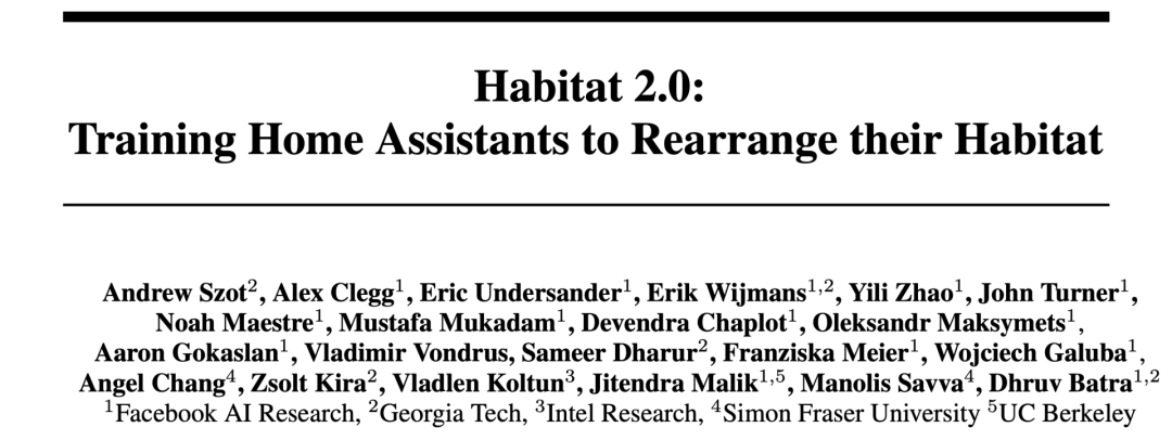《Habitat 2.0: Training Home Assistants to Rearrange their Habitat》的作者最多,有21个。
