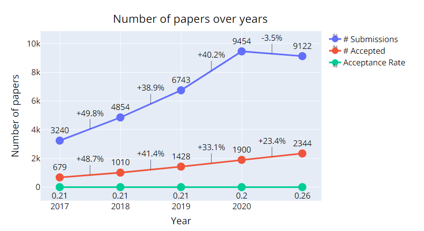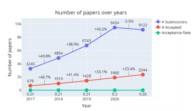 相比于2020年,虽然投稿减少了332篇,但是被接收的反而增加了444篇。
