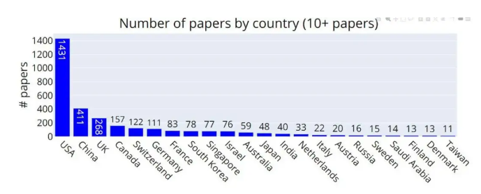 中国大陆排名第二,提交411篇论文,比美国要少1020篇。