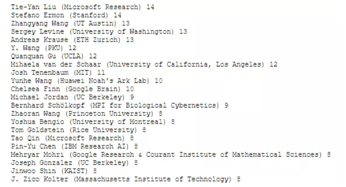 其中,微软亚洲研究院副院长刘铁岩被接收论文最多有14篇,和斯坦福大学的Stefano Ermon并列第一。
