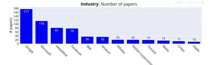 微软、DeepMind、Facebook紧随其后,分别为116篇、81篇和78篇。