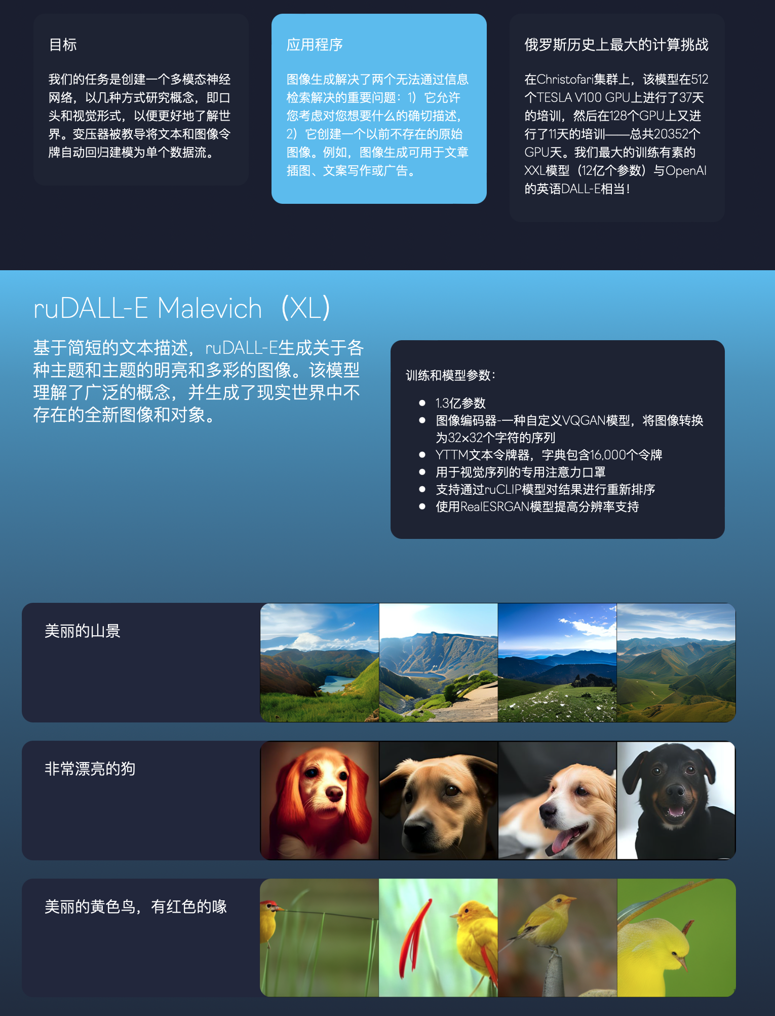 大型模型(12亿个参数)将在云端可用。ruDALL-E是俄罗斯历史上最大的神经网络项目,需要20,000多个GPU天的Nvidia V100进行训练。