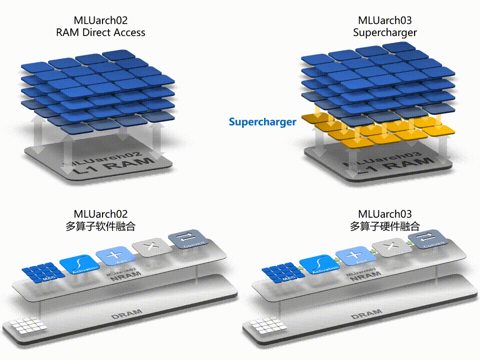思元 370 采用的全新 MLUv03 指令集功能更加完备,效率更高且向前兼容,其还采用了全新的多算子硬件融合技术,在软件融合的基础上大幅减少算子执行时间。