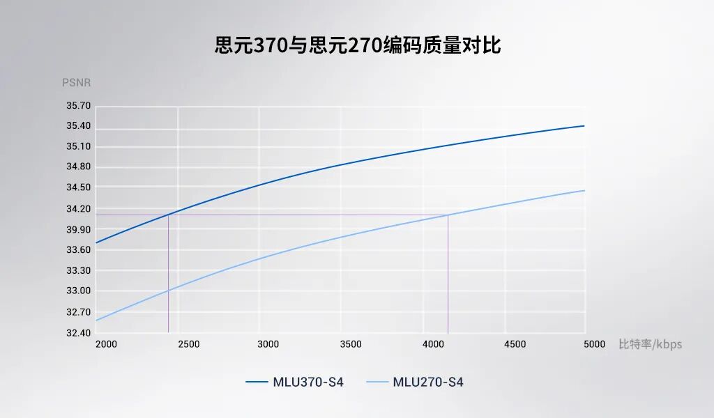 解码方面,思元 370 可支持 132 路 1080p 视频解码或 10 路 8K 视频解码。编码方面,全新编码器通过灵活的码率优化(RDO)控制、多参考帧、二次编码等特性组合,在相同图像质量(全高清视频 PSNR)的情况下比上一代产品节省 42% 带宽,有效降低带宽成本。