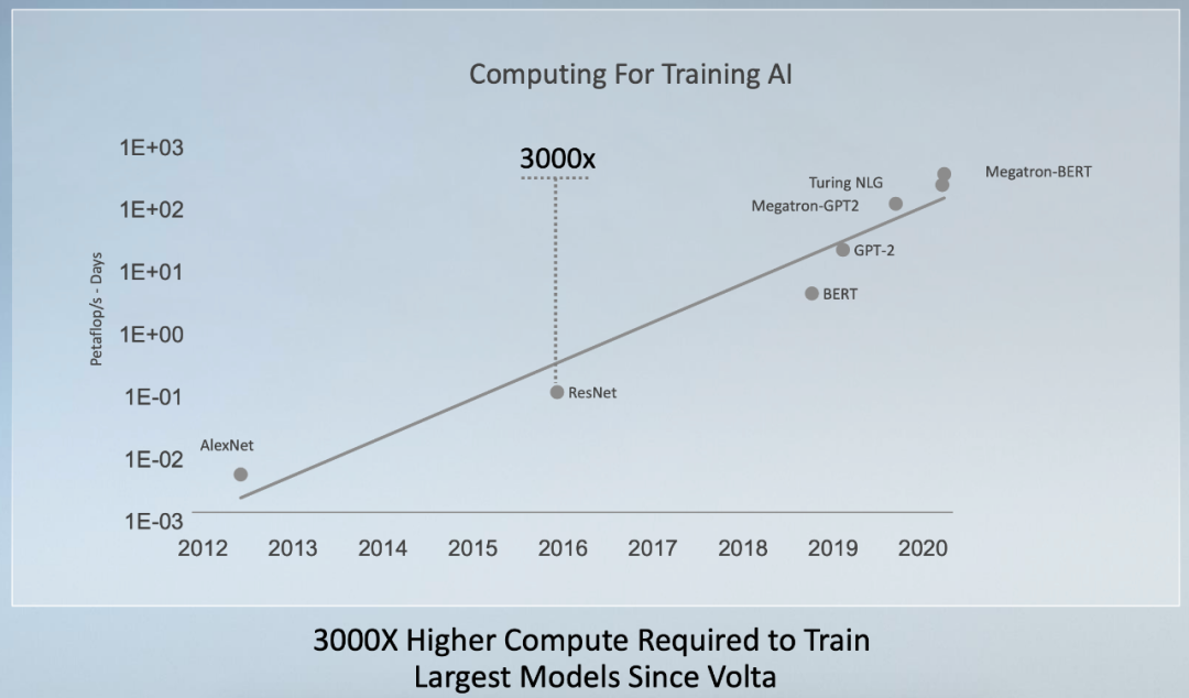 自 2017 年底英伟达发布 Tesla V100 之后,训练最大模型的算力需求增长了 3000 倍。