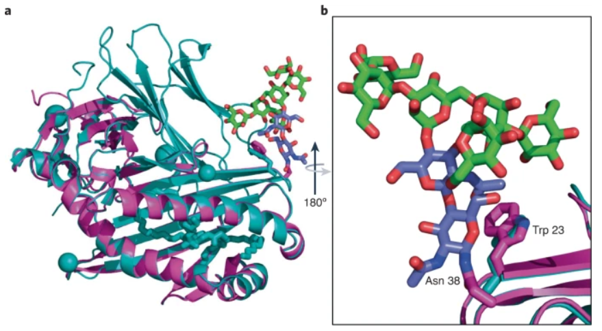 新工具嫁接到 AlphaFold 模型上的 N-聚糖不仅与可用空间兼容,而且显示出与蛋白质表面的高度互补性,其中 Man6 核心在 CH-π 相互作用中与 Trp 23 相关,如图所示晶体结构。
