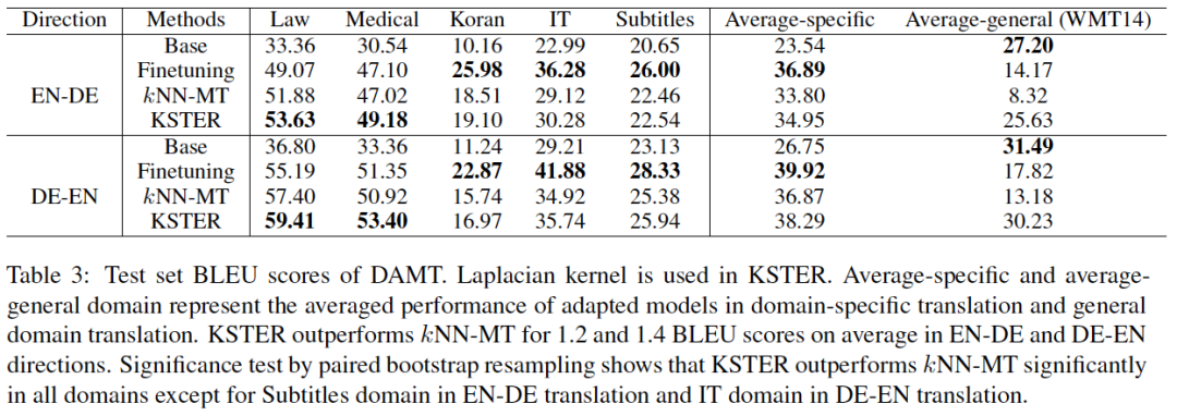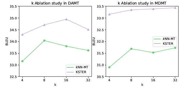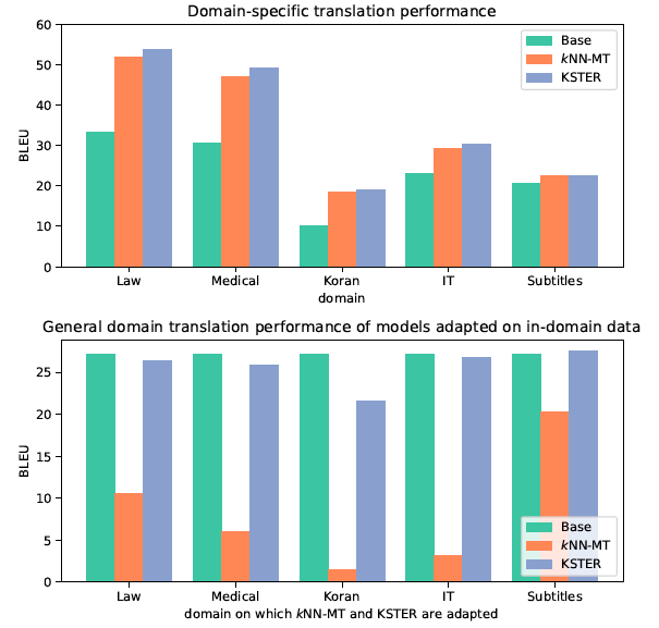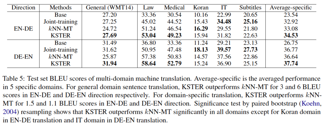 这篇工作在机器翻译领域适应和多领域机器翻译两种任务上进行了实验,KSTER 相比 kNN-MT 在两种任务上均有提升。