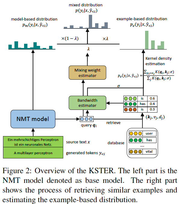 这篇工作主要针对该问题[3],提出了一种动态结合样本检索和神经机器翻译的方法 KSTER (Kernel-Smoothed Translation with Example Retrieval),使得翻译系统在检索到相似样本的情况下能够提升翻译效果,在检索不到相似样本时,也能保持原有的翻译质量,同时保持在线更新的能力。
