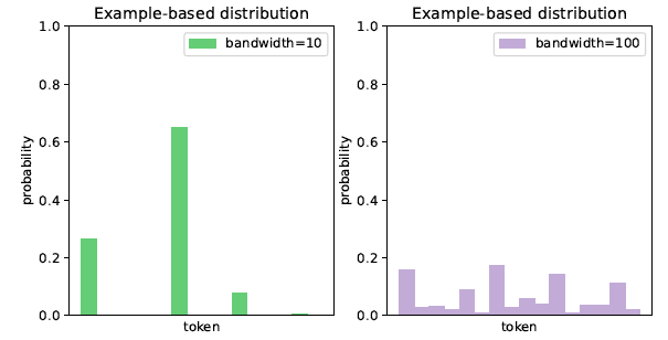 然后利用核密度估计根据检索到的样本估计出一个基于样本的分布 ,其中核函数是一个具有可学习带宽参数的高斯核或拉普拉斯核。带宽参数基于当前上下文和检索到的样本动态估计得出,主要是为了调整 的锐度。当检索出的 k 个样本只有几个头部样本与当前上下文相似时,低带宽的核密度估计会生成一个尖锐的分布,将绝大多数概率质量分配给头部样本,忽略尾部样本引入的噪声。