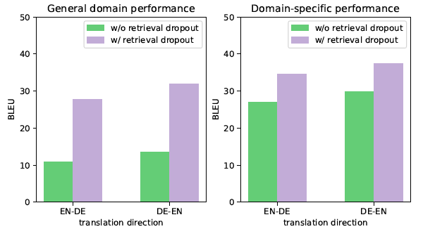 由于训练翻译系统的数据与构建翻译数据库的数据是相同的,在训练时总能检索到 top 1 相似的翻译样本就是查询自身。而测试数据通常在翻译数据库中没有出现过。这种训练和测试的不一致性,导致翻译系统容易过度依赖检索到的样本,产生过拟合的现象。为了缓解训练和测试的不一致性,作者在训练时检索最相似的 k + 1 个样本,并把第 1 相似的样本丢弃,保留剩下的 k 个样本用于后续的计算。这种训练策略被称为检索丢弃,在测试时并不使用这种策略。