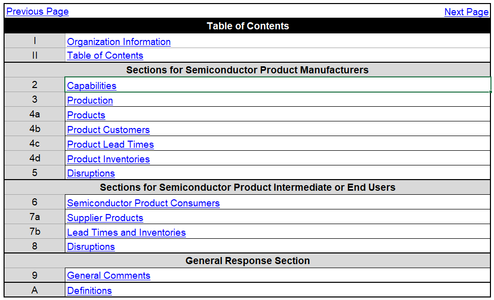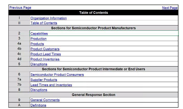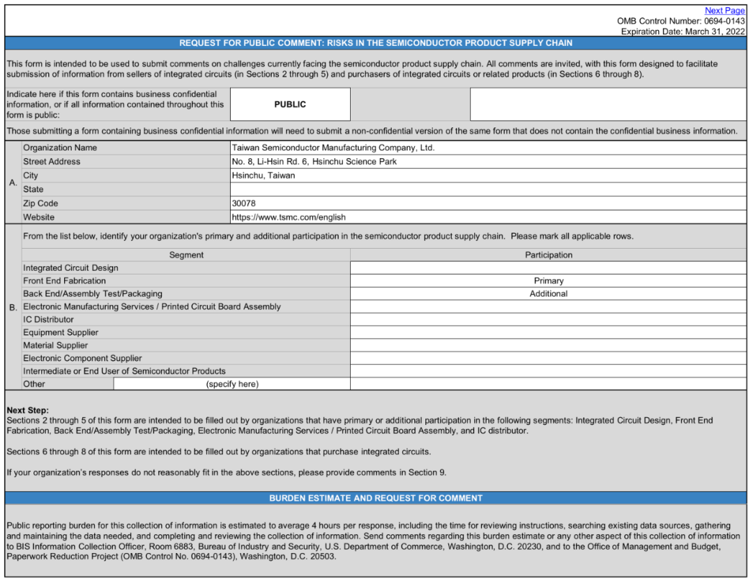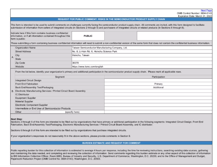 据悉,这次美国商务部的调查共分为 11 个问题和 1 条评论(问卷具体内容请戳:《美商务部要求台积电、三星 45 天内提交芯片库存订单信息 》。台积电上传的内容是一份公开、两份保密的。公开数据中只列出了一般可识别的信息,例如制造的产品类型和比例,并未列出客户公司和交货时间等关键信息。第 4b 至 8 部分留空。