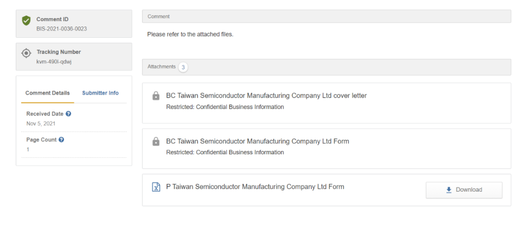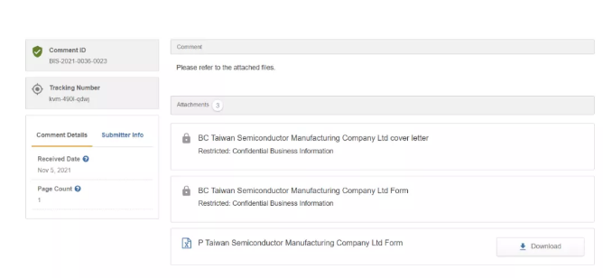 台积电提交了三个档案,包含一份公开表格以及两个包含商业机密的非公开档案。
