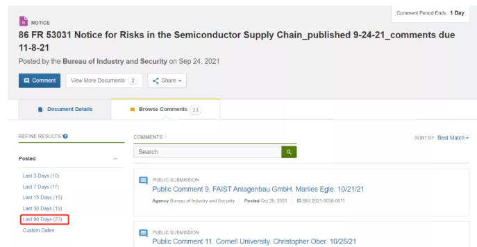 各大半导体厂商在倒计时结束前提交的文件。地址:https://www.regulations.gov/document/BIS-2021-0036-0001/comment