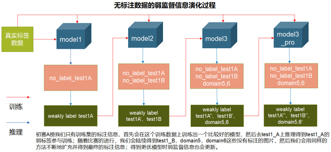 由于这些无标签数据的获取顺序是,初赛A榜时有test1_A,初赛B榜时有test1_B,复赛时有domain5, domain6,因此整个半监督学习的过程如下图所示: