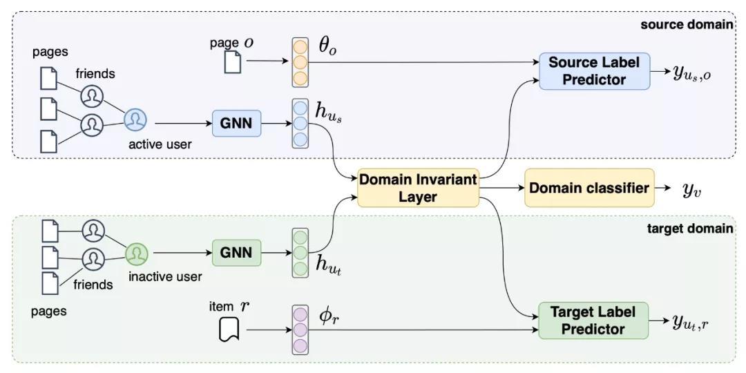 CD-GNN的整体结构如下图所示。可以看到,模型包括源领域和目标领域两个部分,这两个部分结构类似,中间是公共的领域无关层和领域判别器。首先,源领域和目标领域原始特征包括用户的关系网络和item信息,关系网络输入GNN层后,得到用户的特征表示。这样,GNN层根据网络结构信息,将两个领域用户的特征对齐到一个相同的特征空间中。其次,源领域和目标领域用户的特征分布是不同的,本文提出要学习一个映射,根据GNN学到的特征表示得到领域无关的特征,希望这个领域无关特征,一方面对两个领域的学习任务有帮助,同时对领域的差异不敏感。