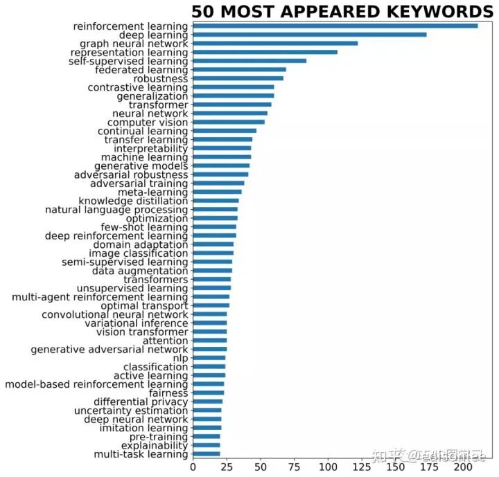 以下条形图列举了提交论文中出现频率排名前 50 的关键词, 排名靠前的依旧是强化学习,深度学习,图神经网络 以及表征学习。同时相比往年数据,可以看到联邦学习,对比学习 和 Transformer异军突起,与今年的研究热点趋势较为相符。