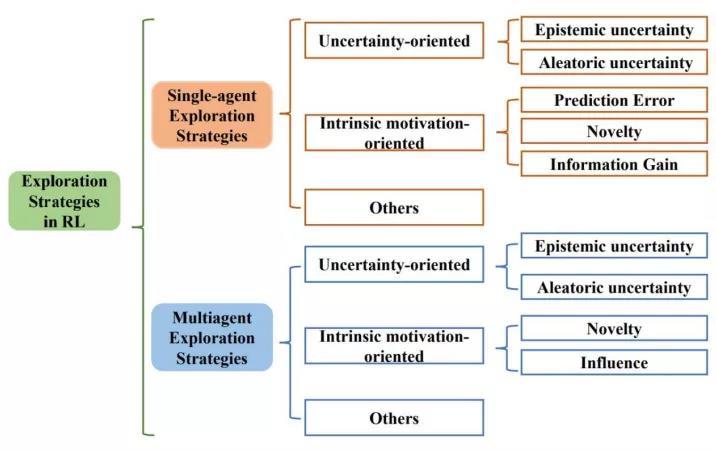 上图展⽰了综述所遵循的分类⽅法。综述从单智能体深度强化学习算法中的探索策略、多智能体深度强化学习算法中的探索策略两⼤⽅向系统性地梳理了相关⼯作,并分别分成三个⼦类:⾯向不确定性的(Uncertainty-oriented)探索策略、⾯向内在激励的(Intrinsic motivation oriented)探索策略、以及其他策略。