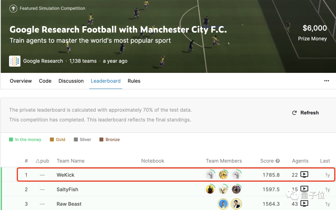 他们先从Kaggle在2020年举办的GRF世界锦标赛中,观摩了最终夺得冠军的WeKick团队数万场的自我对弈数据,使用离线强化学习方法从中学习。