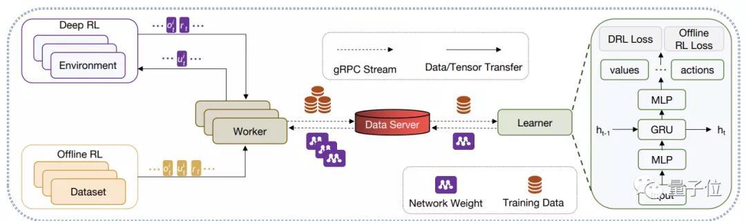 其中Learner负责学习并更新策略,而Worker负责搜集数据,它们通过gRPC进行数据、网络参数的交换与共享。