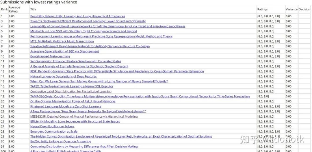 下图为 31 篇平均分 8 分的投稿以及它们的具体得分情况。