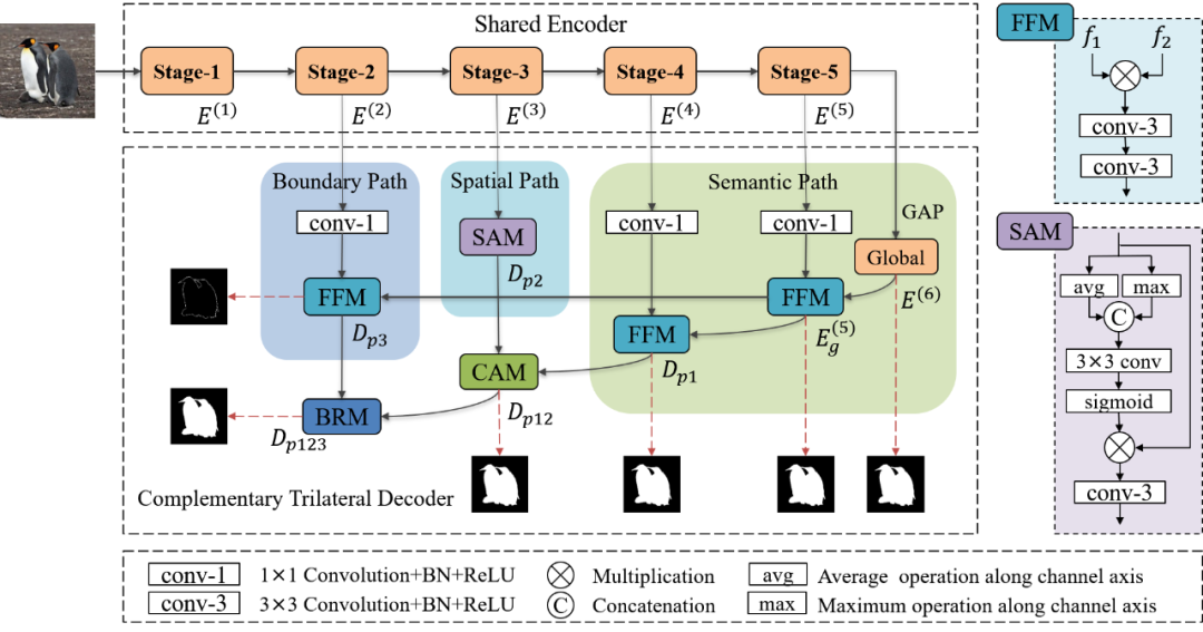 它包括三个分支:语义路径、空间路径和边界路径。顾名思义,这三个分支分别用来解决语义信息的稀释、空间信息的丢失和边界信息的缺失。这三个部分来自编码器的不同阶段并且共享同一个编码器,彼此互补,所以作者按照“粗糙-精细-更精细”的策略逐步合并这三个分支。