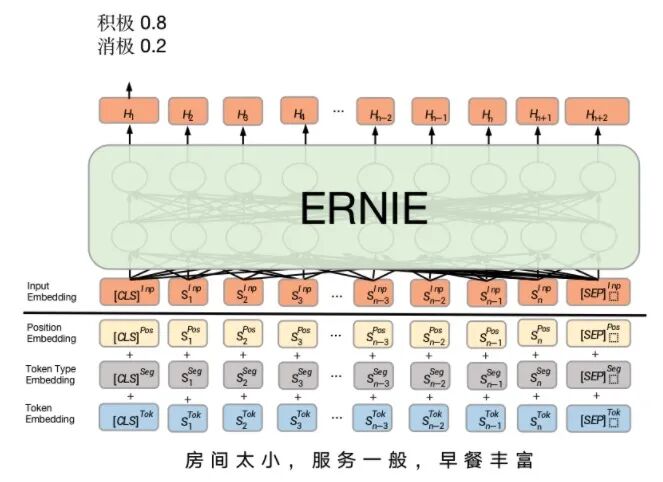 首先是它的输入比上一种方法多了新的信息,但最终每个 Token 依然会得到一个 Embedding,然后经过一个复杂的预训练模型 ERNIE 就会得到最终的输出向量(类似上个方法的中间步骤),进而就可以得到标签的概率分布。预训练模型已经在很多 NLP 任务上达到了最好的效果。