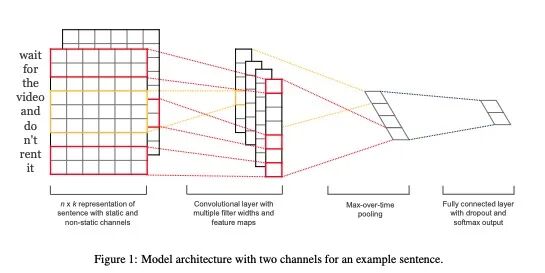 深度学习时代最大的不同是使用了稠密的 Embedding,以及后面可接各式各样的神经网络,实际上是一种「基于上下文」的建模方式。我们以 NLP 领域经典的 TextCNN 架构来进行说明。