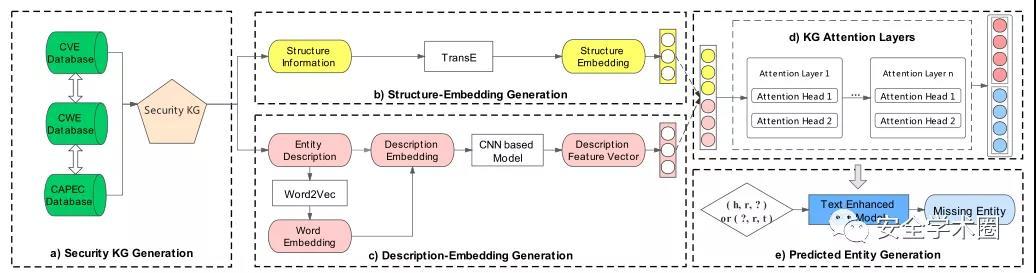 CVE、CWE、CAPEC等安全数据库中记录了各种漏洞、弱点以及攻击方式,这些概念都可以被视为安全实体。安全实体之间有许多种可能的关系类型,了解它们之间的关系对于分析这三个数据库是很有利的。现有的一种基于翻译的知识图谱表示学习方法对于实体预测中的每个三元组进行独立的处理,可能会忽略三元组周围其他实体的重要语义信息。为解决这一问题,作者提出一个文本增强的图注意力网络模型(Text-enhanced GAT),突出了周围邻居实体的知识重要性,能够从安全数据知识图谱中获得更多的结构和文本信息。