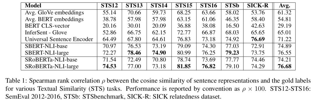 首先看无监督任务,SBERT 训练数据:Wikipedia,NLI。注意,这里 NLI 数据是用来训练 SBERT 的,因为它是个相似度输出的模型(这点可能对其他模型略不公平,因为引入了新数据)。本任务评估的其实是预训练模型输出的句子向量表征的效果。结果如下图所示: