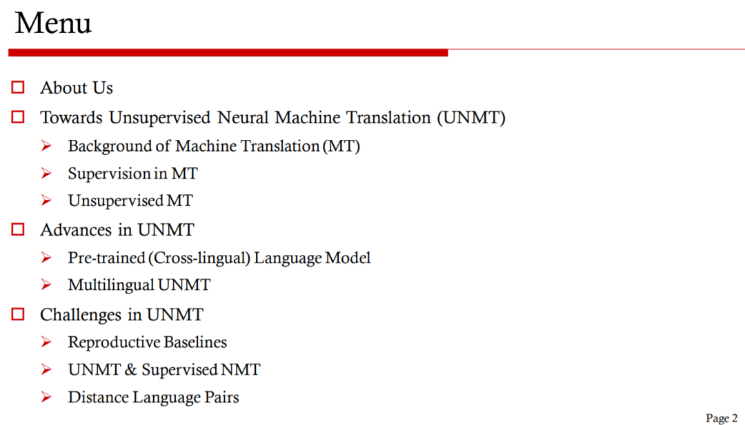 无监督跨语言表示初始化方法与去噪、反翻译等机制一起,发展了无监督神经机器翻译(UNMT),取得了令人印象深刻的效果。与此同时,UNMT仍面临若干挑战。本教程首先介绍UNMT的背景和最新进展。然后,我们审查了UNMT面临的一些挑战,并就该技术目前的表现给出了实证结果。