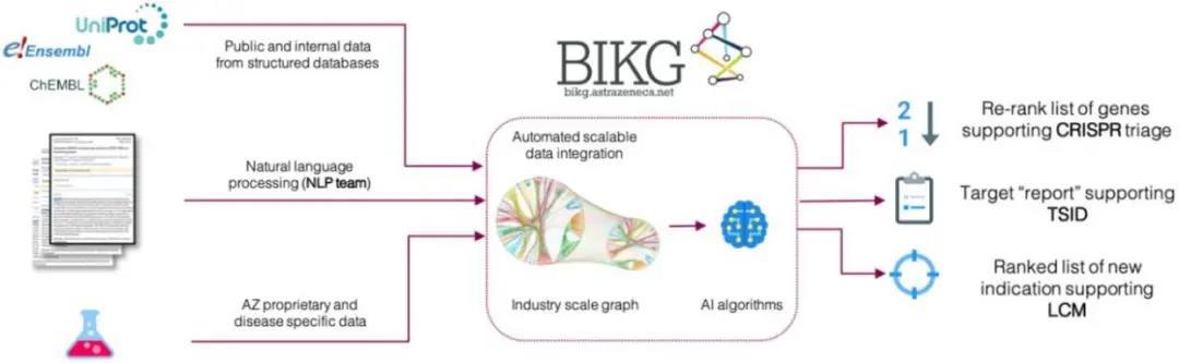 BIKG项目的重点在于构建一个集成内部和外部相关数据的生命科学领域的知识图谱,暂时仅供阿斯利康内部使用。它可以应用于机器学习算法并获得新的洞察力。该方法在几个示例用例中已经证明了它的价值,例如CRISPR推荐和靶点识别。另外,这样的知识图谱还拥有组织层面上的次级效益: