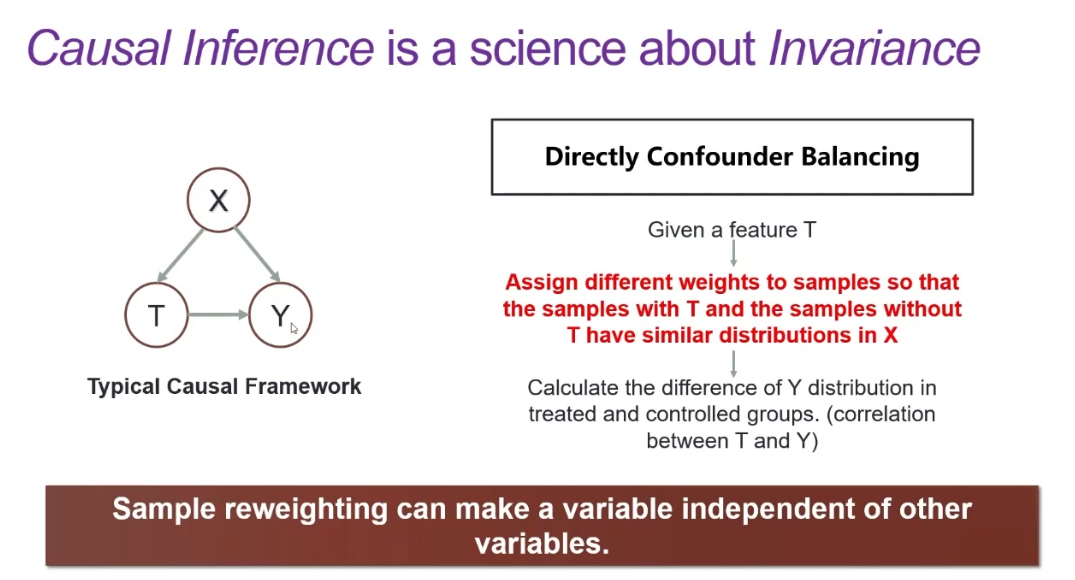 因果推理是一种与不变性相关的科学。如上图所示,在经典的因果模型中,我们试图控制 X,寻找 T 的变化对 Y 的影响。具体而言,利用观测数据,我们会通过样本重加权(Sample Reweighting)将 T=1 和 T=0 时的样本具有相似的 X 分布,如果这两种情况下的 Y 有显著变化,则 T 对 Y 有因果效应。此时,我们估计出的 T 对 Y 的因果效应平均而言对于 X的变化是具有不变性的。