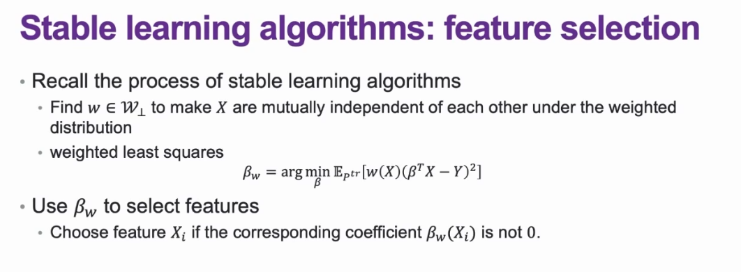 现有的常见稳定学习算法包括:(1)DWR 算法,学习一组样本权重,使任意两个特征之间线性无关(2)StableNet:引入随机傅里叶特征机制,使变量之间在深度学习场景下严格独立(3)SRDO:明确目标分布,并采用密度比估计进行重要性采样,学习样本权重。上述算法通过不同的方式学习出使 X 更为独立的加权函数。