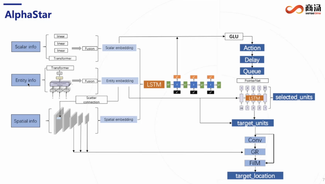 因此,算法网络的结构设计难度相应增加。Alphastar设计了如图所示的结构,该结构融合了各种顶尖、有效的网络结构。算法的输入可以分成三类,这三类输入信息首先需要进行整合。具体来说:
