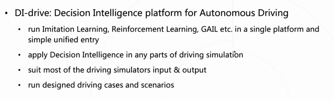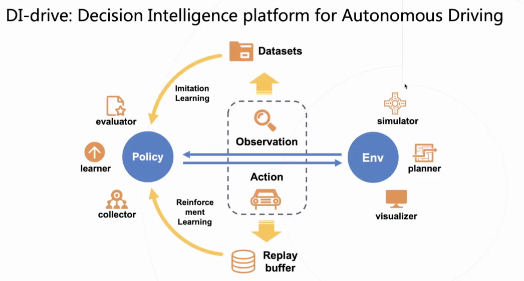 我们基于决策AI构建了一项自动驾驶的决策AI平台,名叫 DI - drive。它的功能主要是将模仿学习、强化学习为代表的决策AI方法融合到一起,并且,将同步融合各种不同的模拟数据的输入输出。同时,它还能定义自动驾驶中的策略和环境接口。图中展示了上述决策过程。