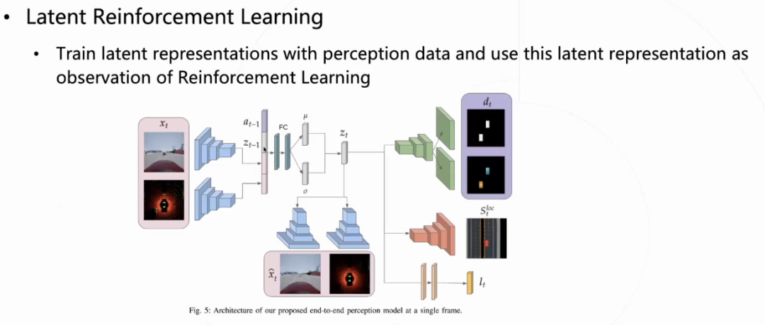 如图所示,在输入了RGB图像后,模型能够通过训练变分编码器,输出与输入相同的RGB图像。那么此时,我们可以通过网络中的编码器Encoder得到低维度的驾驶相关信息。然后模型可以再使用编码器的输出作为强化学习的观测输入,从而训练强化学习相关的部分。这种方法也取得了不错的效果。