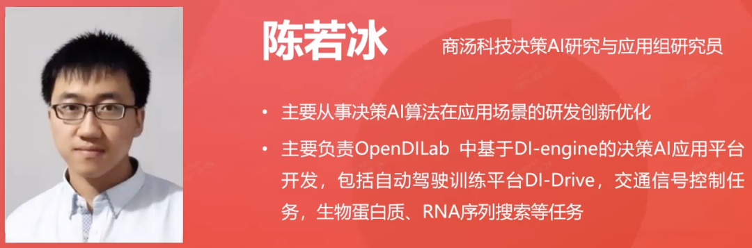 陈若冰,商汤科技决策AI研究应用组研究员。主要从事决策AI算法在应用场景的研发创新优化,负责Opendilab中基于DI-engine的决策AI应用平台开发,包括自动驾驶训练平台DI-Drive,交通信号控制任务,生物蛋白质、RNA序列搜索等任务。
