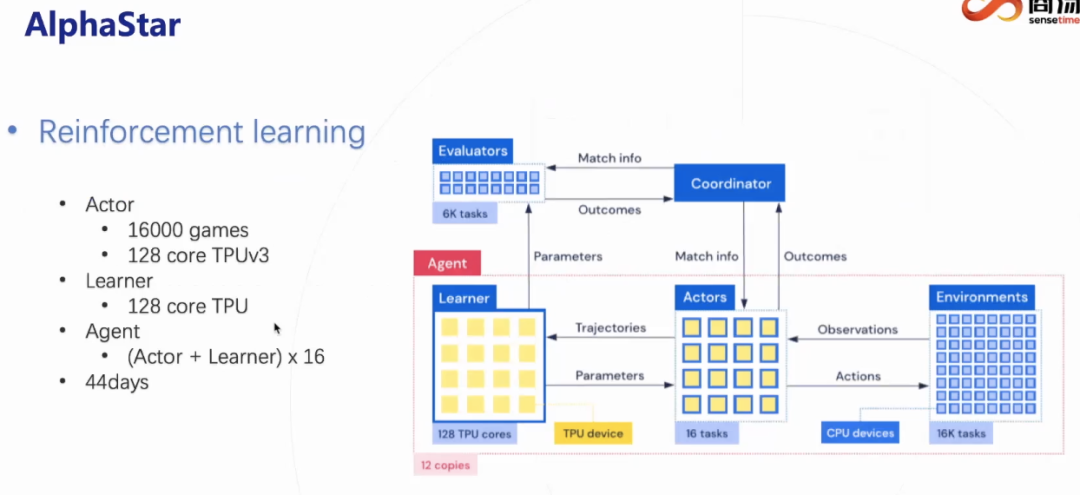 在实际的训练过程中,Actor+Learner的结构形成一个Agent,模型一共包含了12个Agent,并将其复制16次,也就是进行了几百万次对局。在该工作中,训练共用时44天。