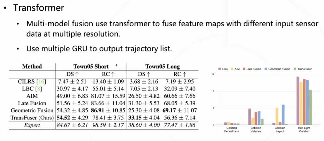 此外,该工作也没有直接输出控制信号,而是借鉴了之前的工作,输出预测的预测轨迹。具体来说,它没有输出具体的预测点,而是通过一个循环网络(门控循环单元GRU)结构来迭代地输出若干个坐标点,再通过将这些坐标映射到频率坐标系中,然后将频率坐标系中的结果输入给PID控制器,并最终得到最终的输出给汽车的动作控制信号。因此我们看到,这种方法融合了模仿学习的优点,还加上了Transformer的交互能力,实现了目前模仿学习领域中最好的效果。