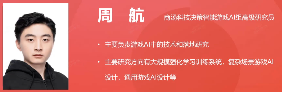 周航,商汤科技决策智能游戏AI组高级研究员。主要负责游戏AI中的技术和落地研究,他的主要的研究方向是大规模强化学习训练系统、复杂场景游戏AI设计,和通用游戏AI设计。