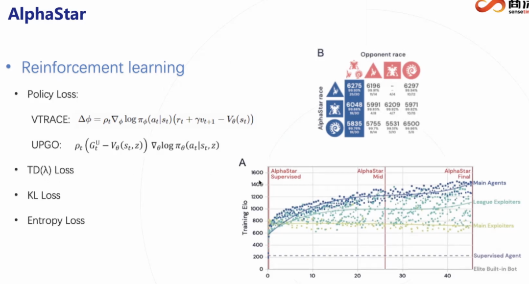 首先在策略损失函数上,他们应用了VTRACE损失。VTRACE损失的核心是解决多个Actor和Learner之间Gap的学习过程。此外,他们提出了UPGO的策略更新方式。UPGO能够让我们的模型避免一些“坏Action”的事件。他们在实践中使用这两种策略更新参数并训练出良好的结果。