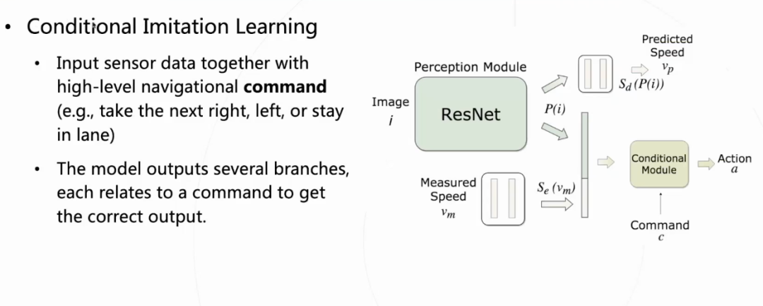 条件模仿学习提出,模型应该在输入传感器信号的同时,输出一个离散的驾驶的控制信号Command,这个控制信号可以用于控制车辆的动作。