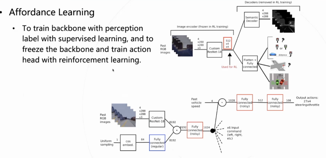上图的第二张是条件模仿学习的一个变种形式,CIRLS。它在原始结构的基础上,使用了更深的Resnet,并且在输入端考虑了车辆的速度。此外,它的输出端也有一个branch分支,来负责速度的输出。网络中还有速度输出的loss函数。这样做是为了让模型能够在输入观测数据的同时,考虑车辆的速度因素。