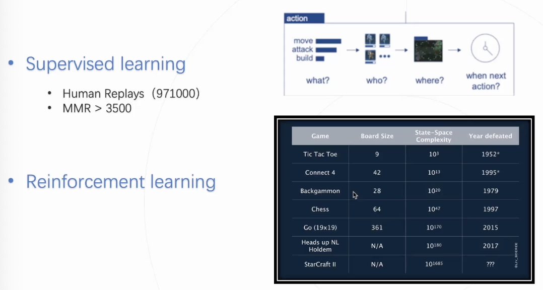 对于监督学习,在动作空间中,我们需要决定哪个节点、在哪、执行什么动作——其搜索货泛化的函数空间范围较大。表格中是统计的不同游戏的状态空间。从中可以看到,由于星际争霸2的游戏难度很大、自由度高、操作的可选择性和策略的种类多样,所以其动作空间范围庞大,与其他游戏不处于一个量级。