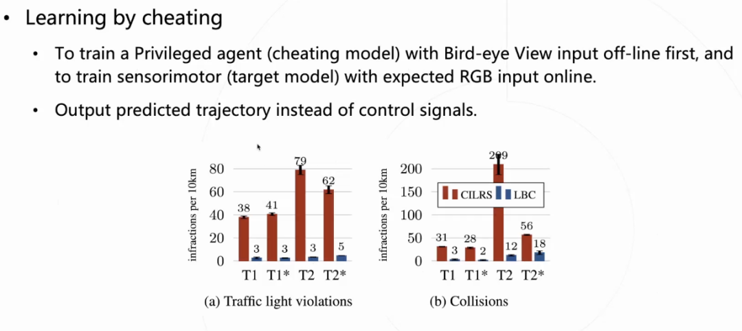 从图中我们看到,在各种场景中,LBC犯错的次数比CIL方法低的多。其中我们主要看一下交通灯场景,如果模型的输入只有图像信息,那么它的交通灯信息只能占到很少的部分,因此学习困难较大。但如果我们有了特权模型,其中交通灯信号就能通过较容易的方式交给策略网络,也就能实现十分明显的性能的提升了了。