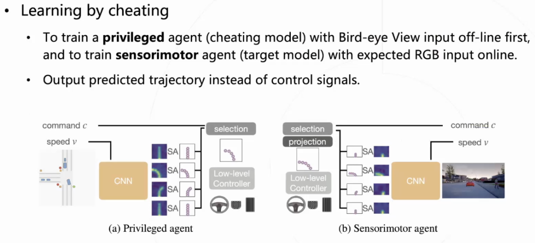 第二个例子,Learning by cheating,欺骗式学习。它要求在原始的基础上进一步强化模仿学习的性能。它提出,如果我们希望模型根据输入的RGB图像直接学习出一个动作,其难度较高,但是如果能够得到一些具有privileged特权特点的信息,这些信息是从输入中无法得到的,那么在训练中,算法就可以将这些privileged特权模型当做欺骗模型,并且在训练中使用在线的目标模型,从而避免模仿学习的偏移问题。