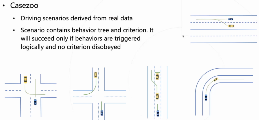 Casezoo的主要特点是,它首先使用了很多实际采集的真实数据,即将超车和跟车等场景的数据在仿真器中进行了构建。第二点,它的每个场景都包含一个行为树(Behaviors Tree)和驾驶标准(Criterion)。
